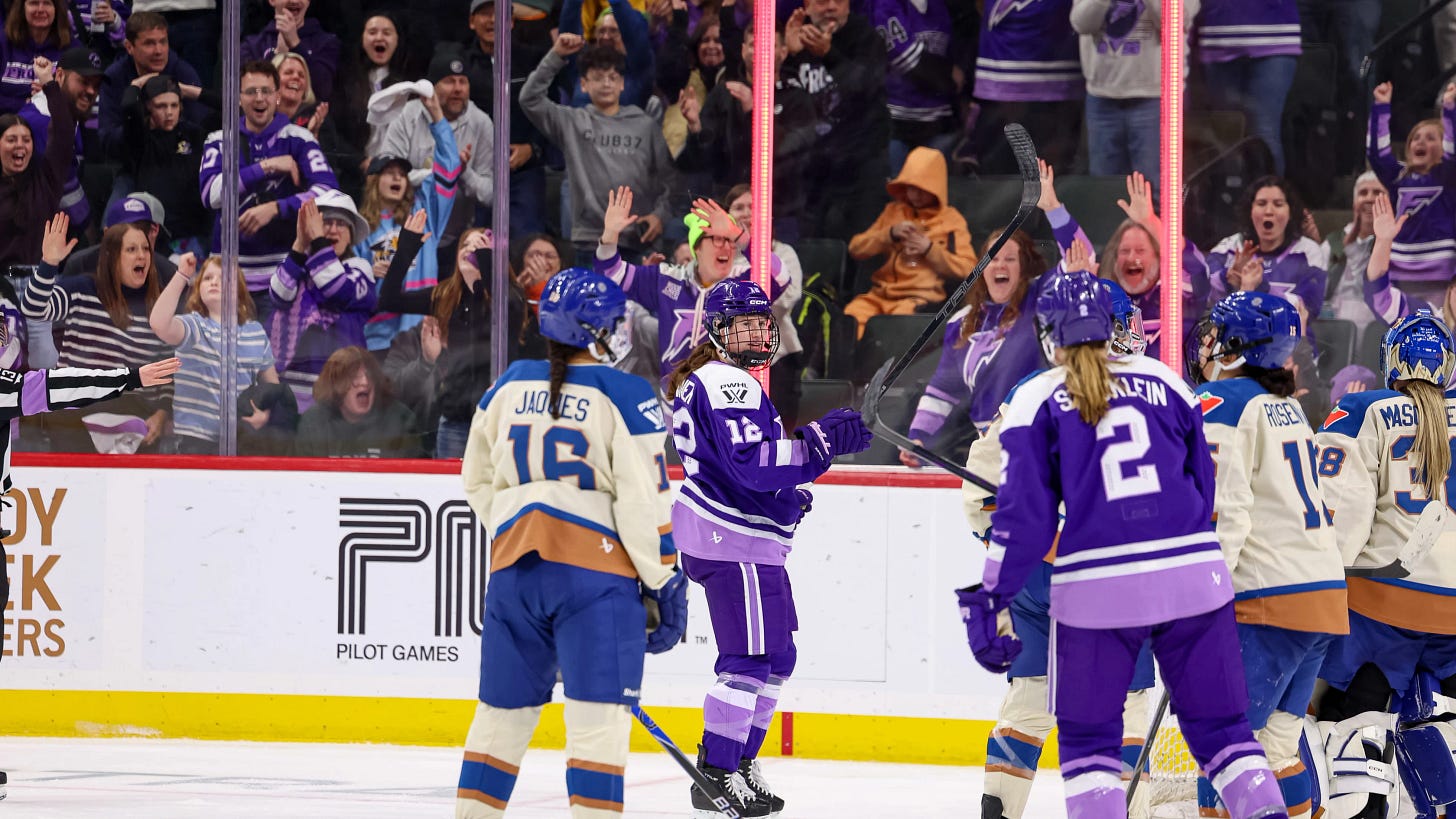 Goals: So many goals and they came from Grace Zumwinkle, Katie Knoll, Taylor Heise, Mae Batherson, and two from Kelly Pannek. Six goals ties the Frost’s record for most goals this season, and 11 total goals ties the PWHL record for most goals in game (Ottawa and Minnesota’s 8-3 game last year).